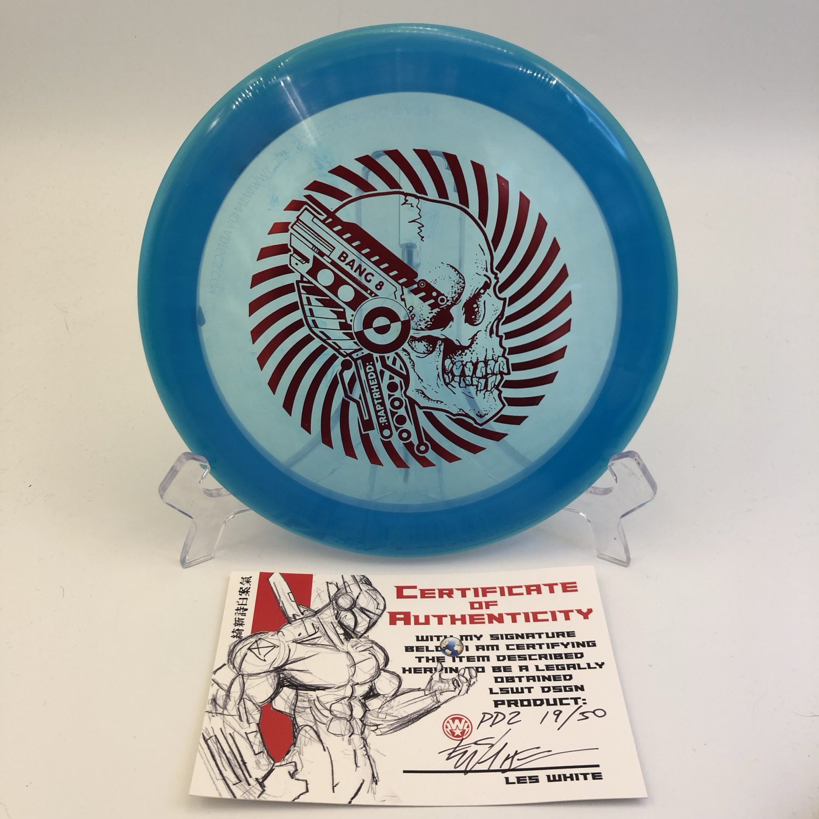 Disc: C-line Pd2 – RAPTHREDD “Bang 8” – Les White Art! – Old run! – Comes with CoA! #19/50 (175g) Profile: small domey Stiffness: medium Condition: New (might be some small storage wear) Color: blue pink, red reflective stamp, (See picture) Ultra RARE!!! Comes with Certificate of Authenticity! Les White Art!