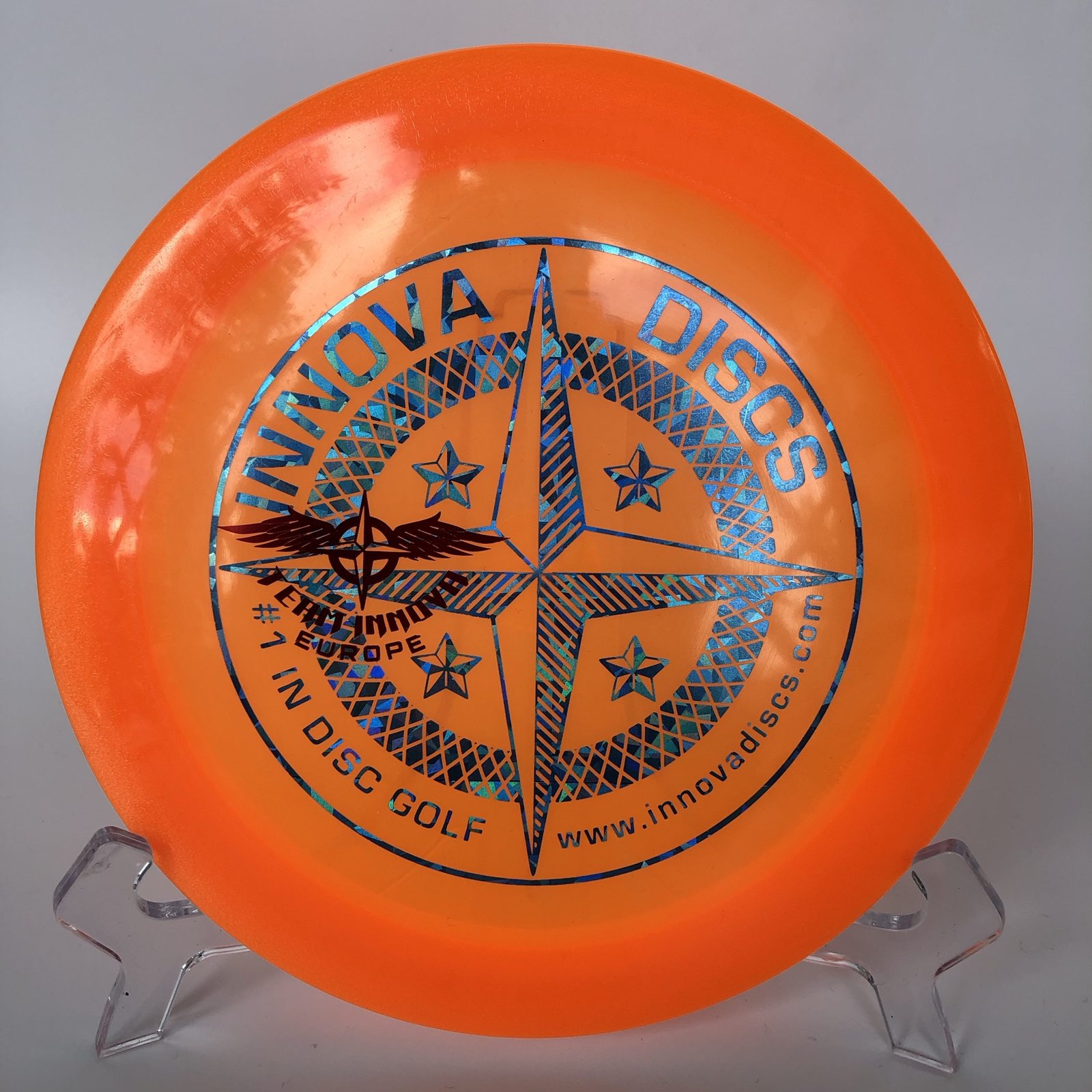 Introducing the Champion Firestorm – First Run “Team Innova Europe”! 🔥 This incredible driver is expertly designed for players looking to elevate their disc golf game. With a weight of 175g and a stunning orange color complemented by a striking blue diamond reflective stamp, this disc is as eye-catching as it is functional. 🌟