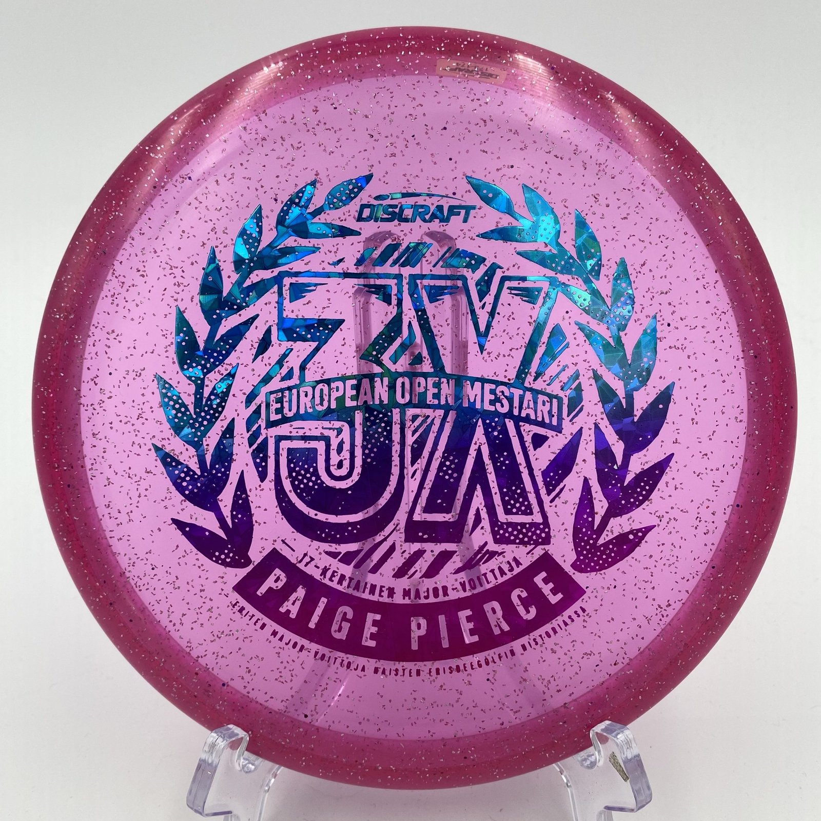 Introducing the stunning **CryZtal Sparkle Fierce – Paige Pierce 3x European Open Mestari** putter, a true work of art designed for disc golf enthusiasts! 🌟 This special run honors Paige’s remarkable achievement of winning her 3rd European Open and her 17th Major title, making it a must-have for collectors and players alike.