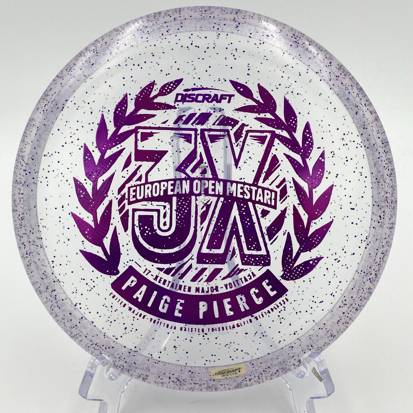 Disc: Discraft CryZtal Sparkle Fierce – Paige Pierce 3x European Open Mestari – Finnish stamp (173-174g) Profile: flat Stiffness: medium hard Condition: New (storage wear) Color: transparent-purple, purple holographic reflective stamp (see picture)