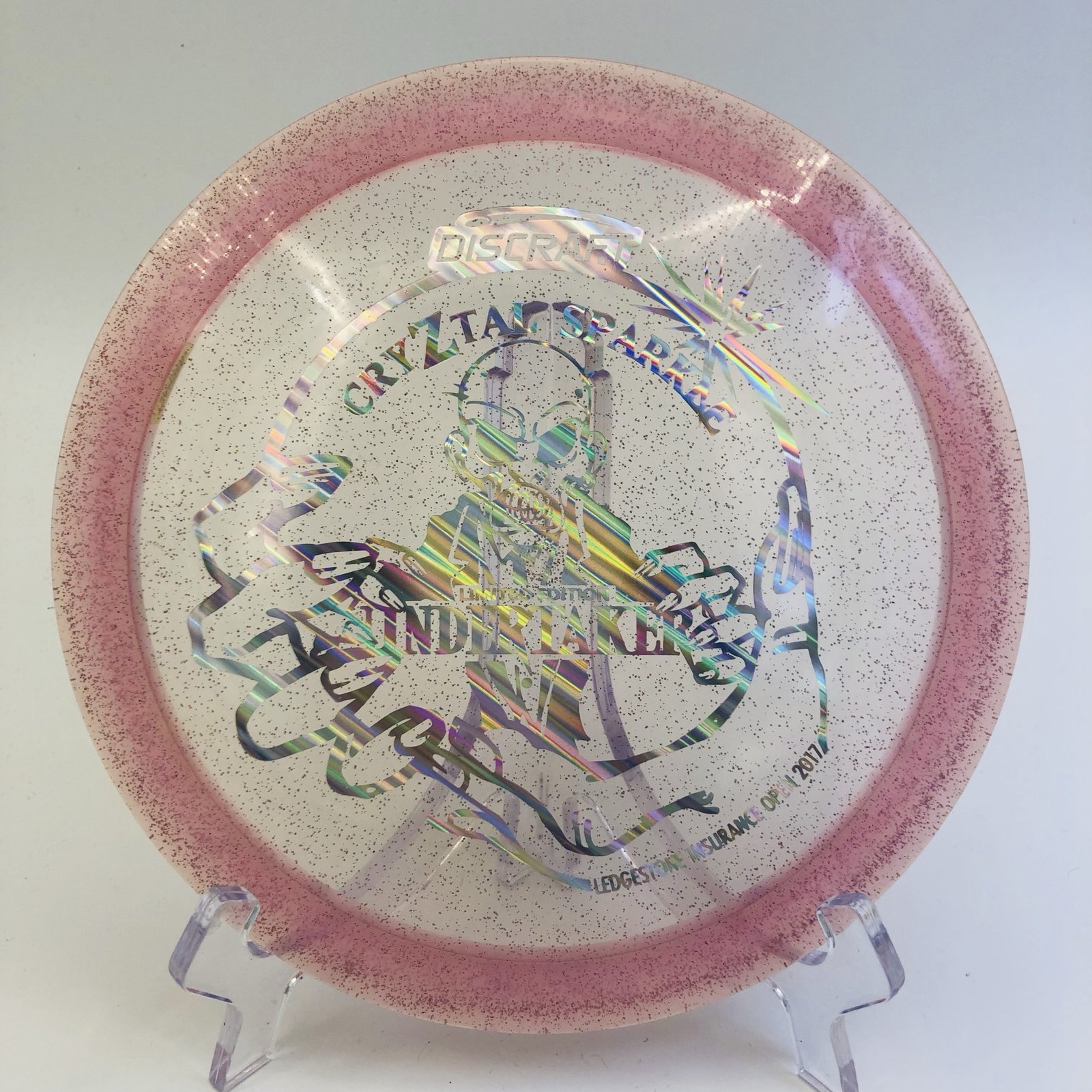Introducing the **CryZtal Z Sparkle Undertaker** – a must-have for any disc golf enthusiast! 🥏 This exceptional driver, a limited edition from the Ledgestone Open 2017, is not only stunning with its light pink transparent hue and silver holographic stamp, but it also boasts impressive performance on the course.