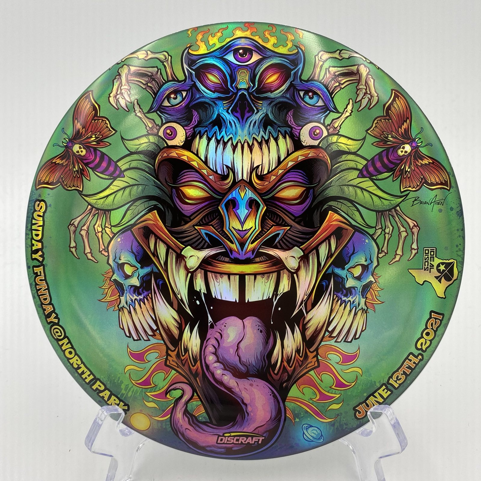Introducing the **ESP Buzzz – Brian Allen Design – Sunday Funday (177+g)**, the ultimate midrange disc that every disc golfer should have in their bag! 🎉 Designed with precision and flair by artist Brian Allen of Flyland Designs, this disc doesn’t just perform well; it looks fantastic with its full foil prism artwork. The ESP Buzzz is known for its reliable flight characteristics with a **Speed of 5**, **Glide of 4**, **Turn of -1**, and a **Fade of 1** – making it a go-to choice for players of all skill levels!