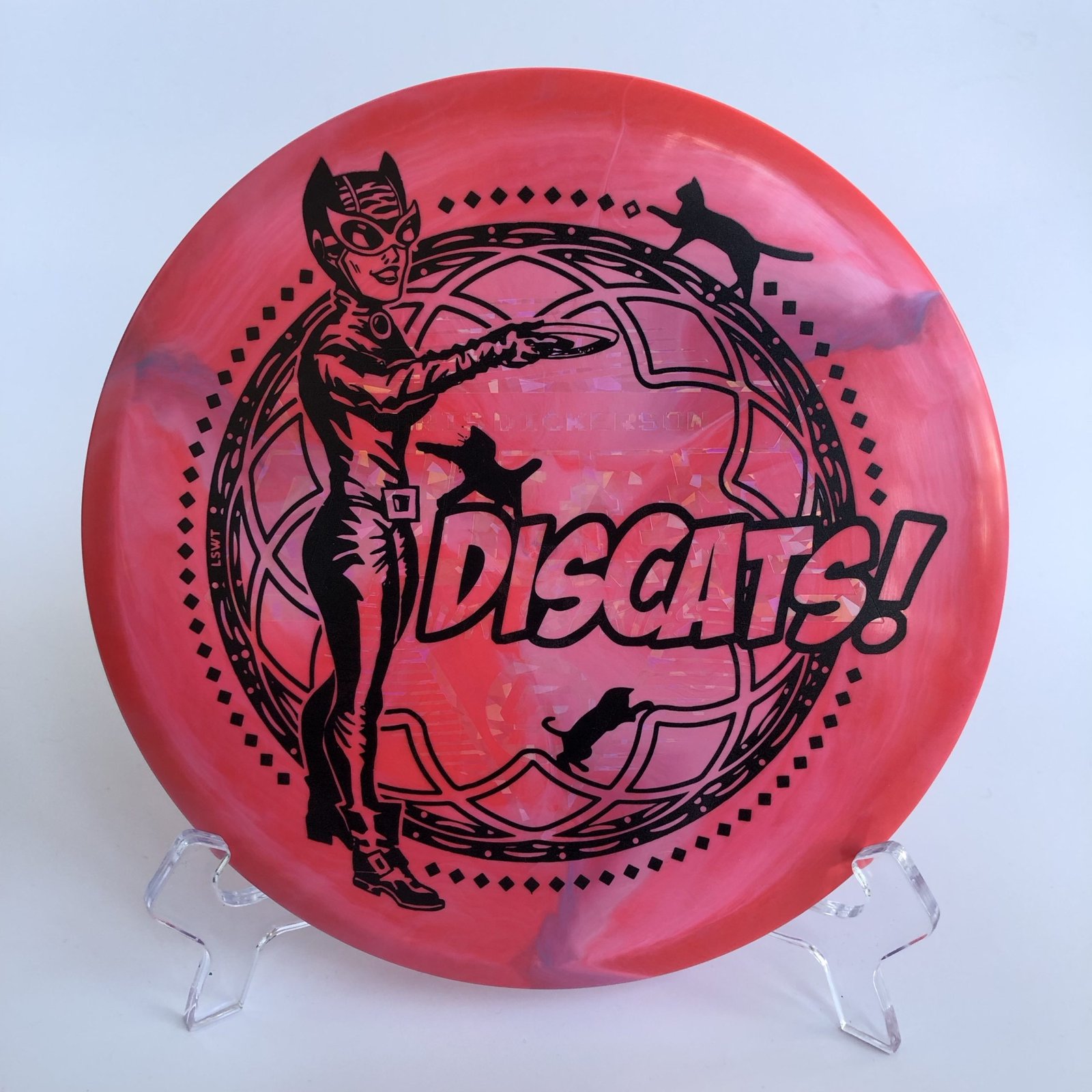 Introducing the **ESP Swirl Buzzz – Chris Dickerson 2022 Tour Series – DisCats “Catwoman”**! 🎉 This stunning disc combines functionality with vibrant design, featuring a gorgeous pink-red swirl that catches the eye on the course. With a flight rating of **Speed 9, Glide 5, Turn -1, and Fade 2**, this fairway driver is engineered for precision and control, making it a perfect choice for both beginners and seasoned players alike. 🏌️♂️