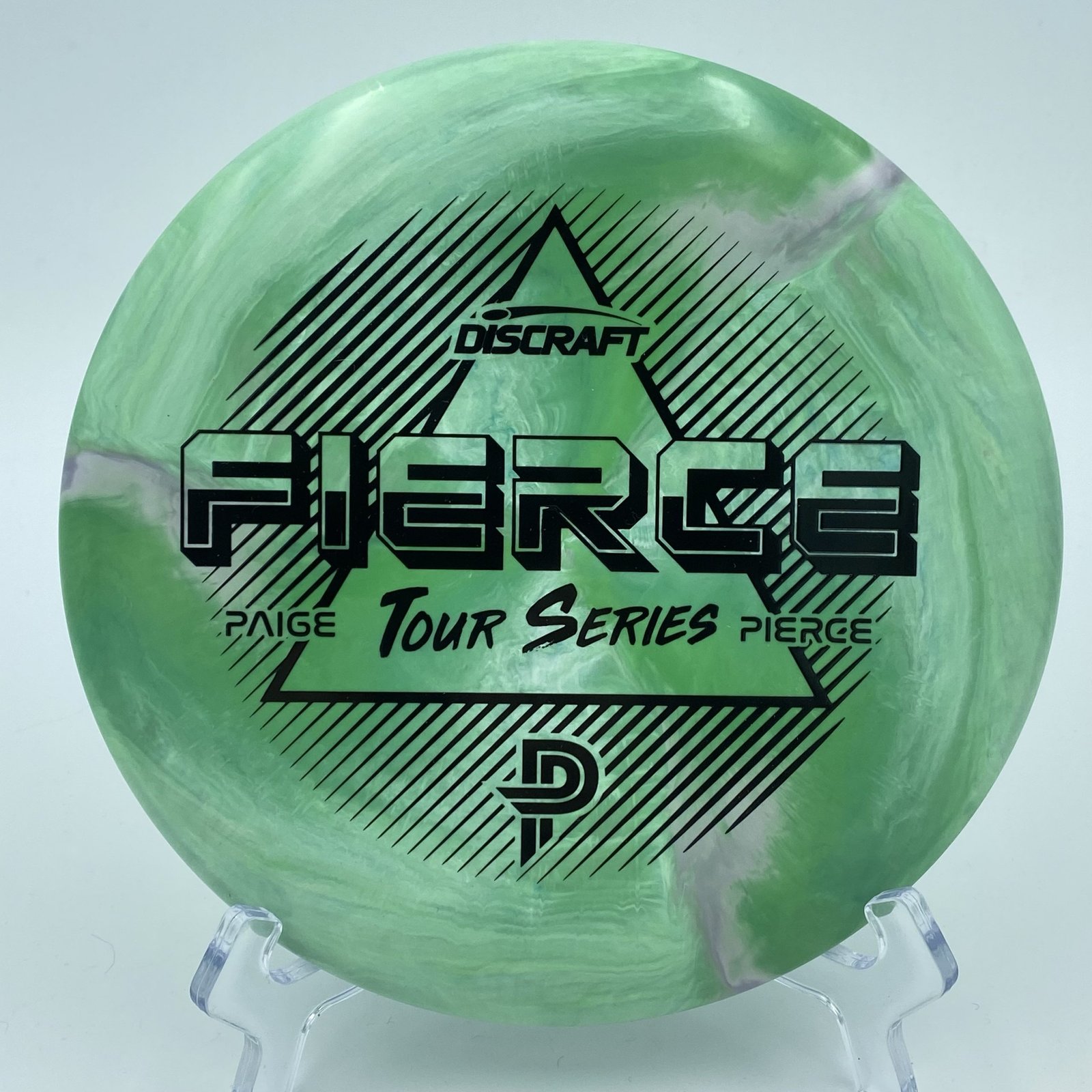 Disc: Discraft ESP Swirl Fierce – Paige Pierce 2022 Tour Series (173-174g) Profile: flat Stiffness: medium Condition: New (storage wear) Color: green-purple swirl, black stamp (see picture)