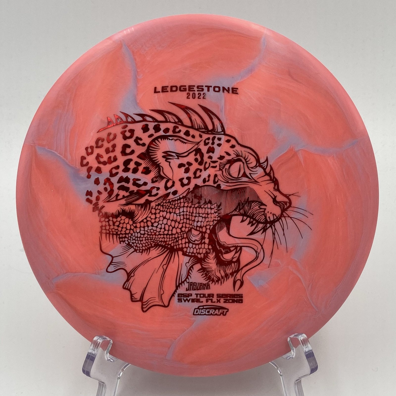 Disc: Discraft ESP Swirl FLX Zone – Tour Series 2022 Ledgestone Edition (173-174g) Profile: small domey Stiffness: soft Condition: new (some storage wear, small stamp drop-out) Color: orange-pink swirl, red reflective stamp (see picture)