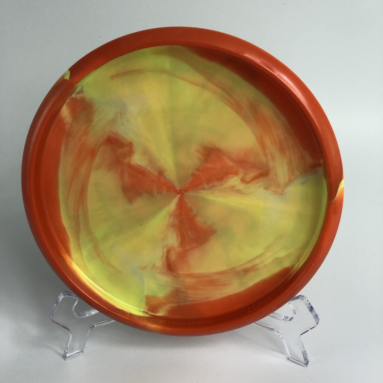 Disc: Discraft ESP Swirl Luna – Paul McBeth 2022 Tour Series – DisCats Profile: Flat Stiffness: Medium – medium hard Condition: New (storage wear) Color: red-yellow swirls, ghost stamp + black DisCats stamp (see picture)