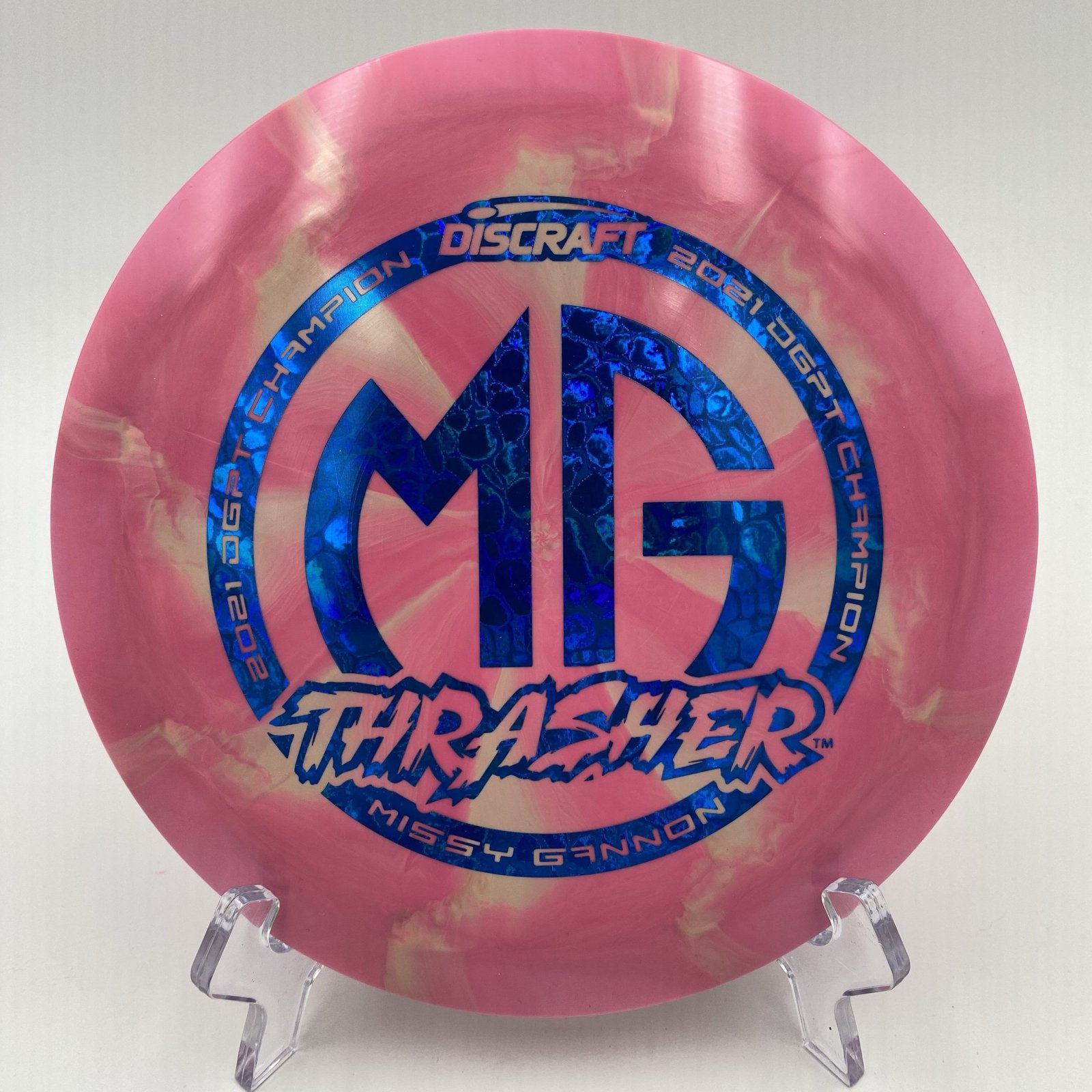 Introducing the ESP Swirl Thrasher – Missy Gannon 2021 DGPT Champion Edition! 🚀 This high-speed driver is designed for those looking to unleash incredible distance without breaking a sweat. With a flight rating of Speed 12, Glide 5, Turn -3, and Fade 2, the Thrasher offers a perfect balance of distance and control. The -3 turn means that even players with lower arm speeds can achieve maximum distance while maintaining a stable flight path.