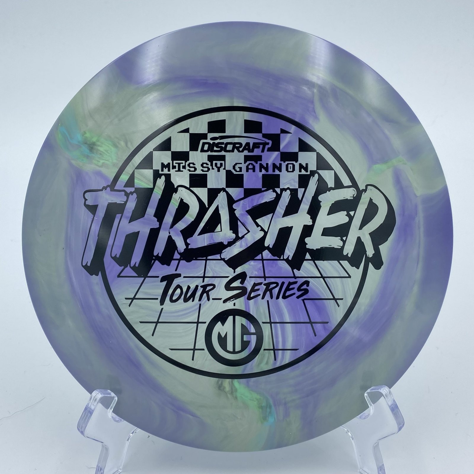This limited edition ESP Swirl disc, characterized by its stunning green and purple swirl colors with a sleek black stamp, not only looks amazing, but delivers exceptional performance. Its medium stiffness provides a comfortable grip for all types of throws. Whether you’re launching long drives on the course or practicing in your backyard, the Thrasher is ready to take your game to new heights! 🌟