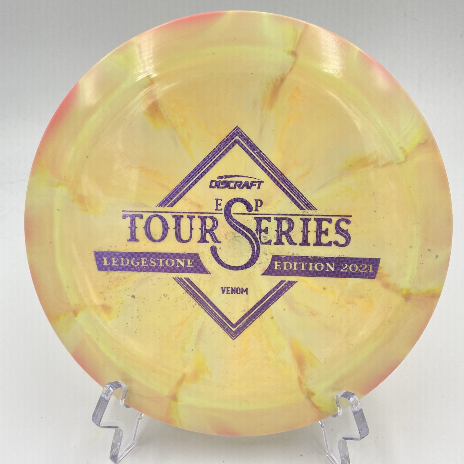 Crafted in premium Tour Series ESP plastic, this Veonom features stunning yellow swirl patterns mixed with bursts of color, all in a flat profile and medium-hard stiffness for that premium feel. It’s the Ledgestone 2021 Edition with a turquoise small box stamp, and as a missprint with noticeable stamp drop-out (check the pics!), it’s a unique collector’s piece without breaking the bank. Plus, buying this Tour ESP disc directly supports Discraft’s touring pros—how cool is that? 🏆 New condition with just minor storage wear, this 170-172g driver is ideal for advanced players seeking overstable control and style. Grab yours and dominate the course—your bag (and your throws) will thank you! 🌟 (Word count: 178)