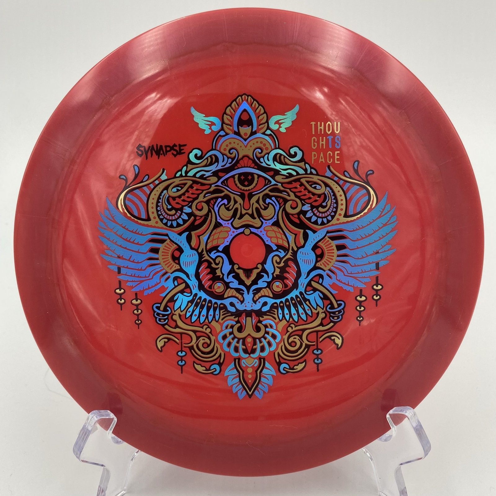 Disc: Ethereal Synapse – Thought Space Athletics – Dragon (173-175g) Profile: flat Stiffness: medium Condition: New (some small storage wear) Color: red swirl, gold-black-blue holographic reflective stamp (See picture)
