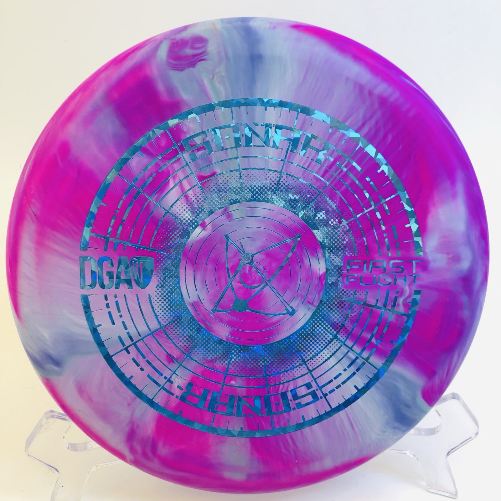 Introducing the DGA First Flight Sonar (170-172g) – a putter crafted for precision and reliability! 🎯 This striking disc features a unique blue-pink swirl design that not only looks fantastic but also ensures that no two discs are alike. With a flat profile and a hard stiffness, the Sonar feels great in your hand and provides the perfect grip for your putts and approaches.