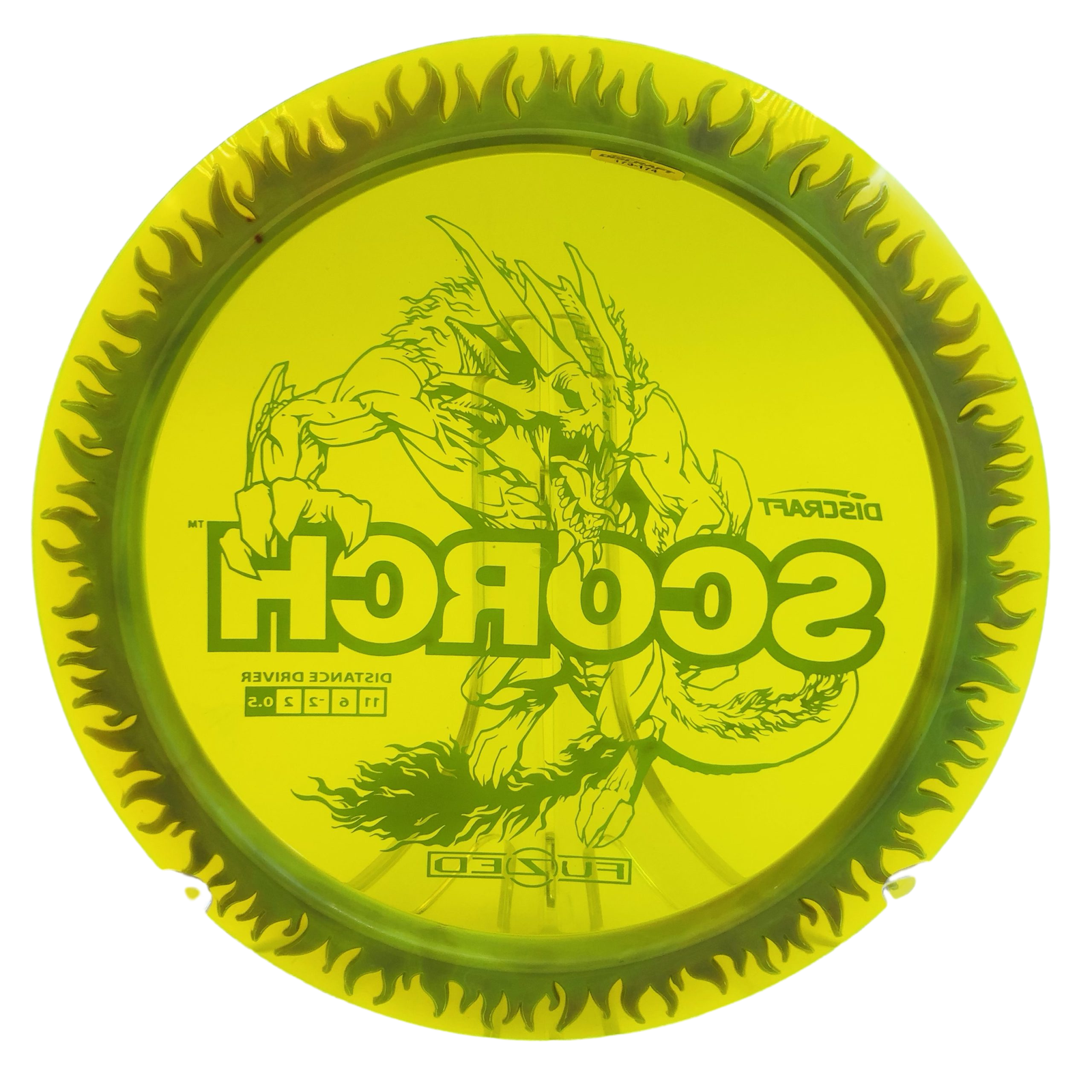 🔥 Introducing the FuZed Line Scorch Flame (173-174g) – Stock Run! This incredible stable driver boasts a captivating flame-burst effect on the rim, making it as visually stunning as it is functional. With a speed rating of 11 and glide of 6, this disc is designed for those big turnover shots and hyzer flips that define its signature flight. It also features a turn of -2 and a fade of 2, which means you can expect a consistent ‘S’ curve on every throw!