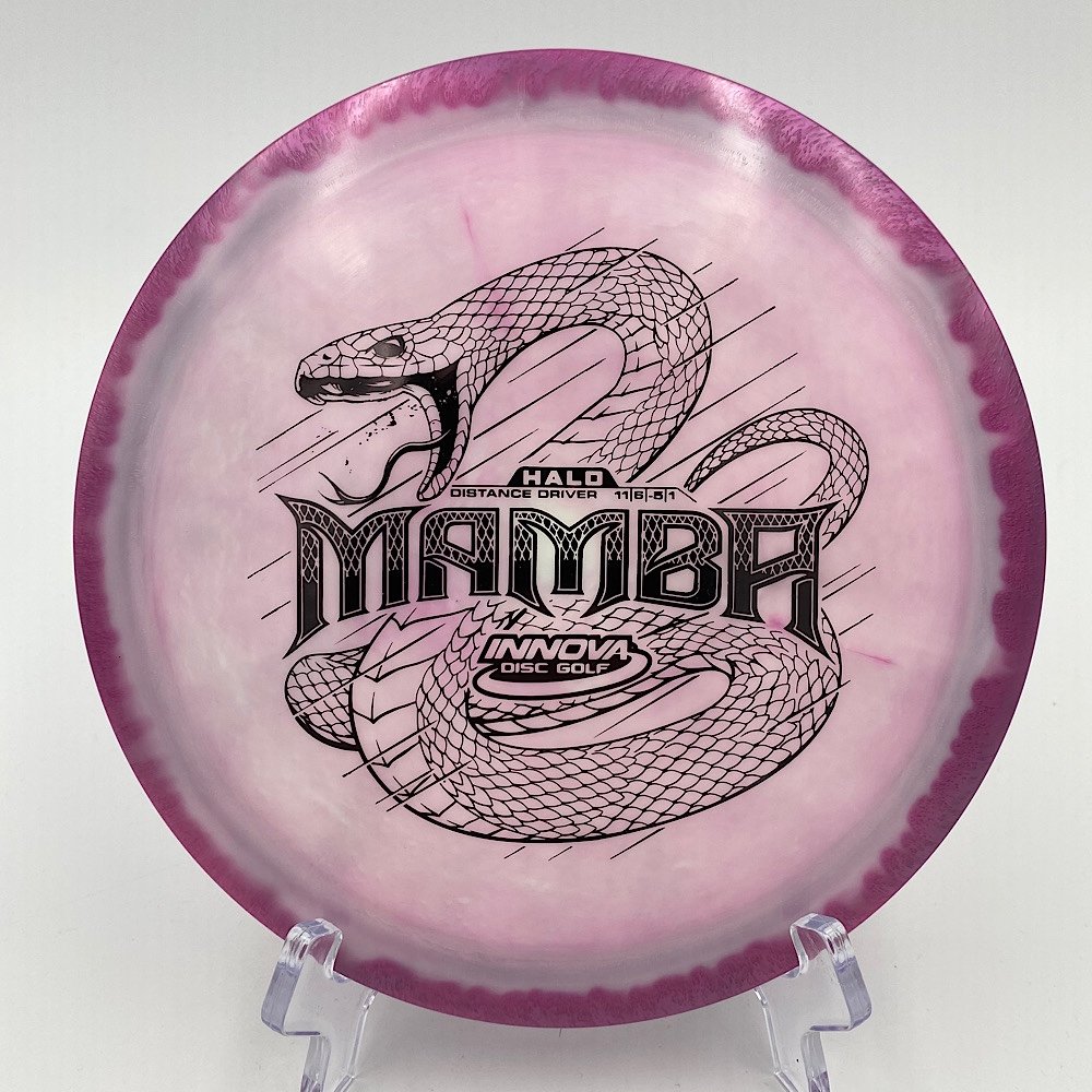 Introducing the Halo Star Mamba (173-175g), your new go-to driver for long, effortless throws! 🚀 Designed by Innova, this eye-catching disc features a mesmerizing purple-pink swirl that is sure to turn heads on the course. Its small domey profile combined with a medium-soft stiffness gives you a comfortable grip while allowing for incredible glide and distance.