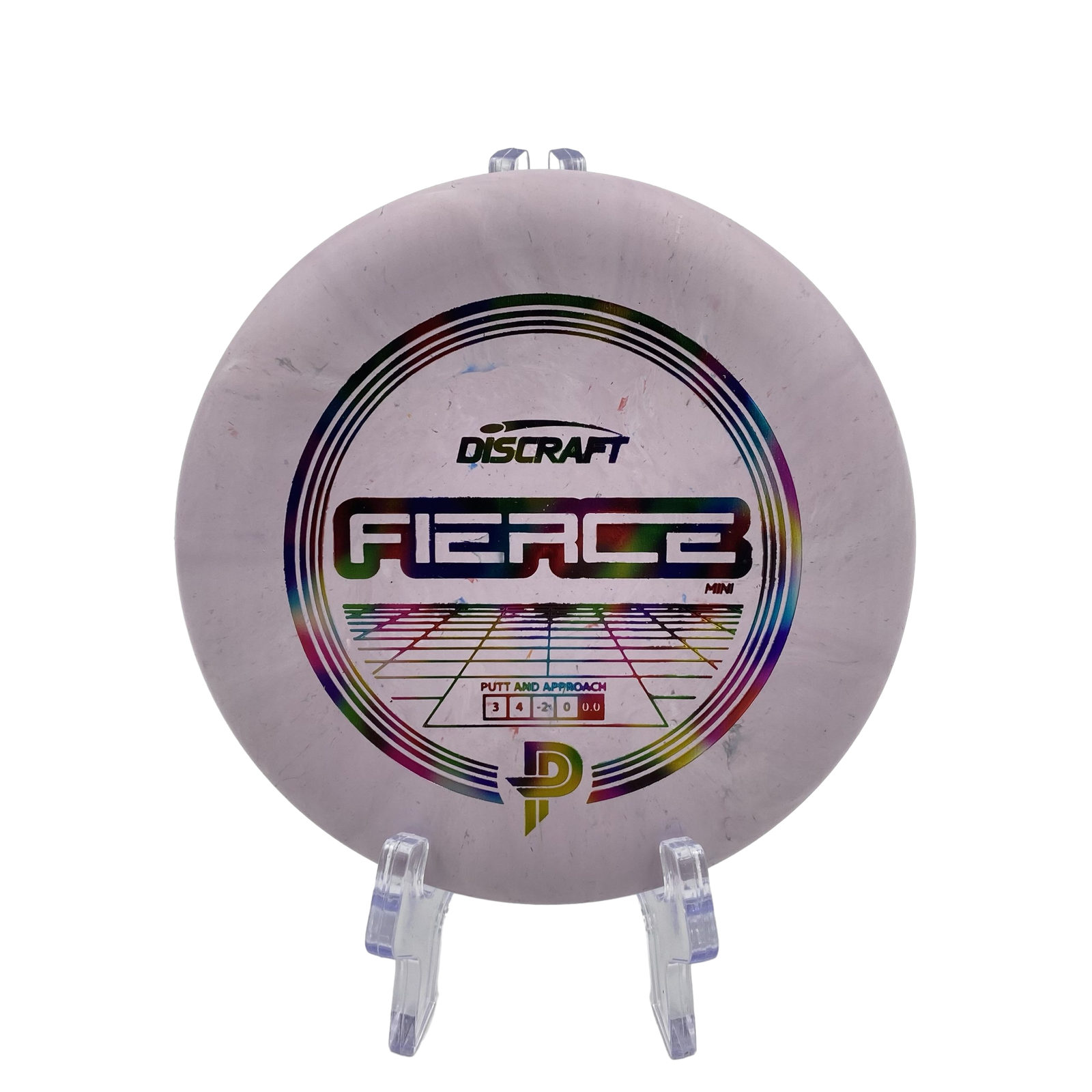 Disc: Discraft Mini Fierce – Paige Pierce (65-72g) Profile: flat Stiffness: soft, tacky Condition: New, storage wear Color: light purple swirl, jellybean reflective stamp, See picture Please Note! This is a MINI disc!!!