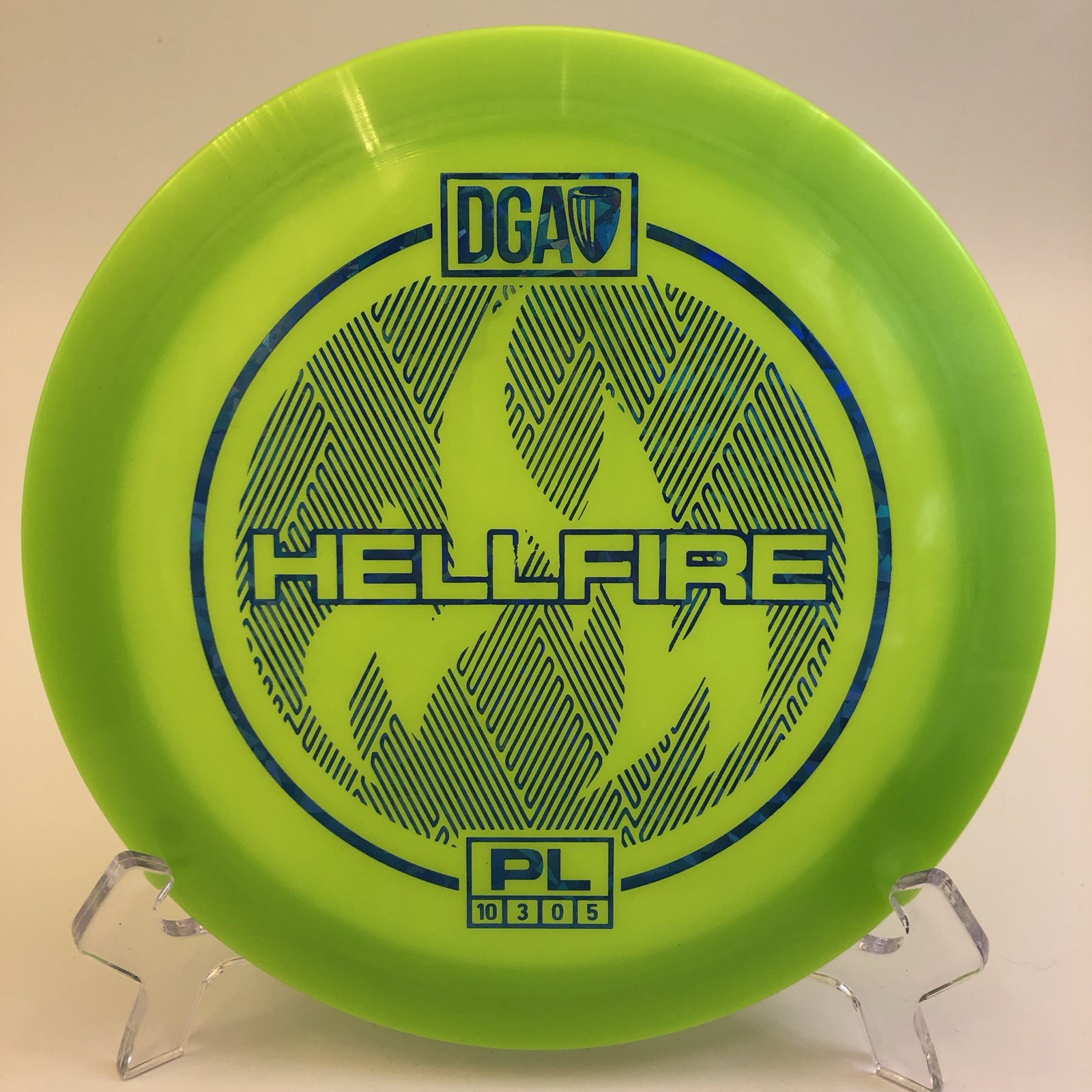Disc: DGA PL Hellfire (170-172g) Profile: flat Stiffness: Medium soft Condition: New (small storage wear) Color: lime green (see picture) Stamp color: blue shatter stamp (see picture)