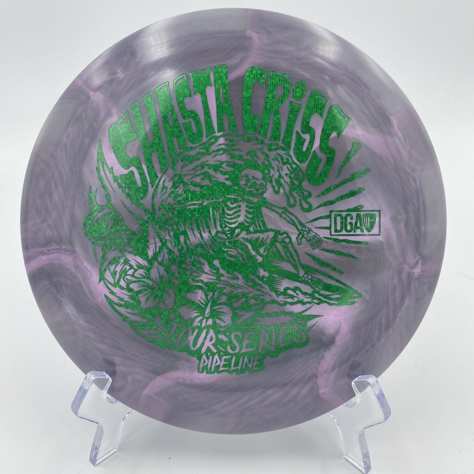 🌟 Introducing the DGA PL Swirl Pipeline – Shasta Criss 2022 Tour Series! This stunning fairway driver, crafted from a beautiful swirly ProLine plastic blend, offers not just eye-catching aesthetics but also exceptional performance. With a Speed of 8, Glide of 5, Turn of 0, and a Fade of 2, this disc is perfect for players at any skill level! 🚀