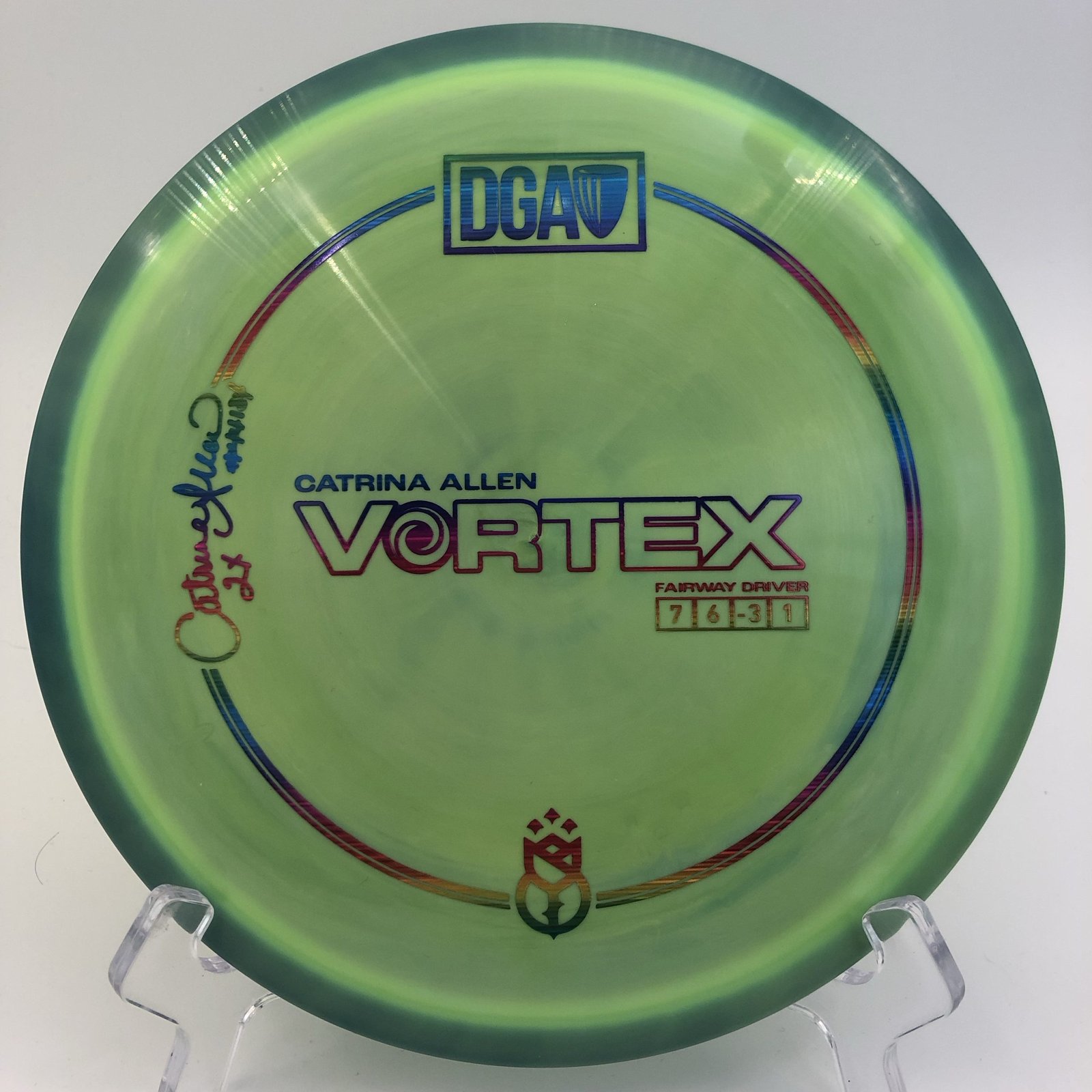 The Vortex offers incredible glide and a controllable turn, making your drives longer and straighter. 🌟 And did we mention the stunning limited edition artwork by John Dorn? This green swirl with a halo rim is not just a disc; it’s a statement on the course!