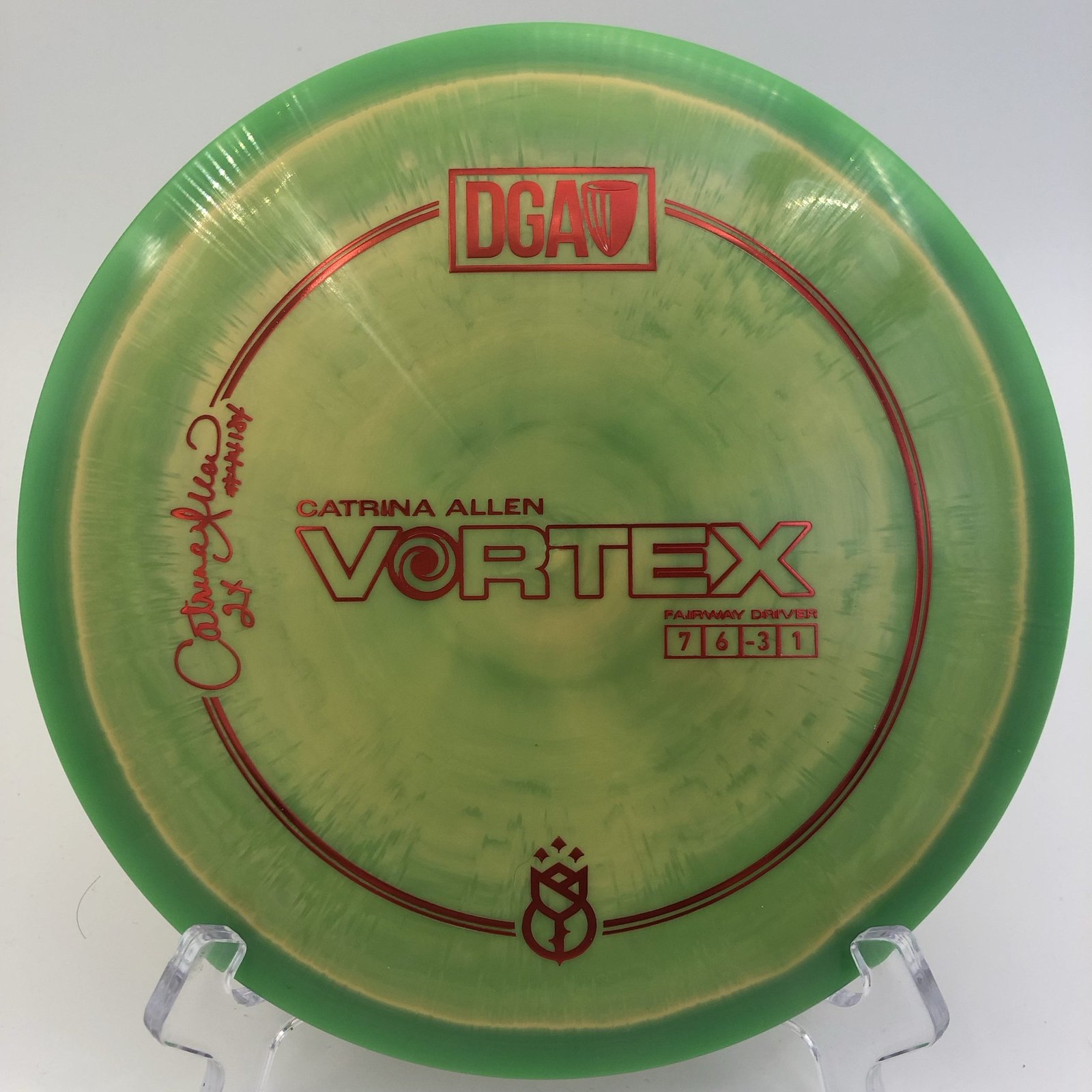 Collaborating with the legendary Catrina Allen, a 2X World Champion, the Vortex features a medium flat profile and a stunning green-yellow swirl color with a vibrant red holographic stamp. This beauty isn’t just visually striking; it also offers wonderful glide and a slight turn, making it perfect for executing those long hyzer flips or navigating through those tricky tree lines. 🌳