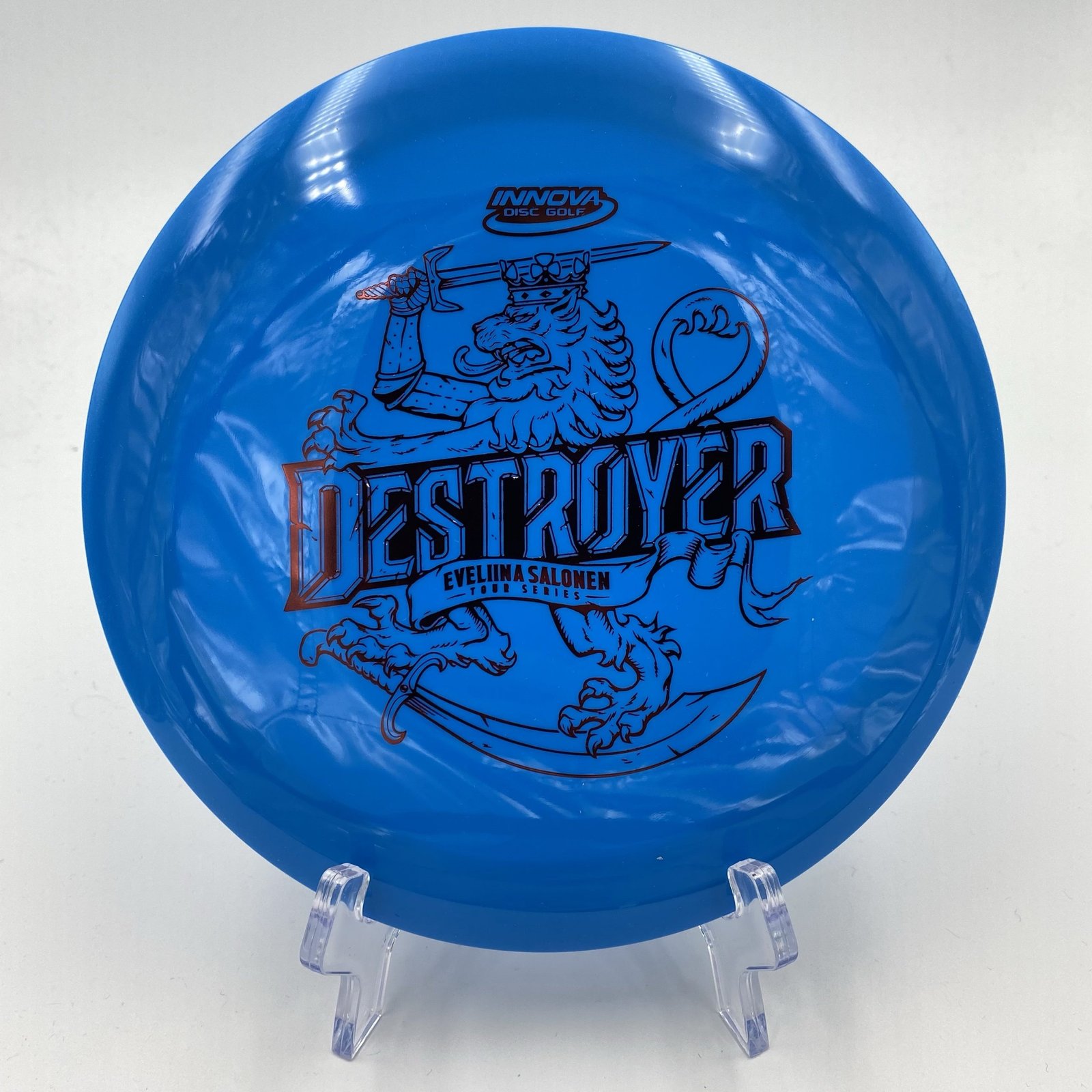 Disc: Innova Star Destroyer – Eveliina Salonen 2021 Tour Series (173-175g) Profile: small domey Stiffness: soft – medium soft Color: blue, (dark red reflective stamp), See picture