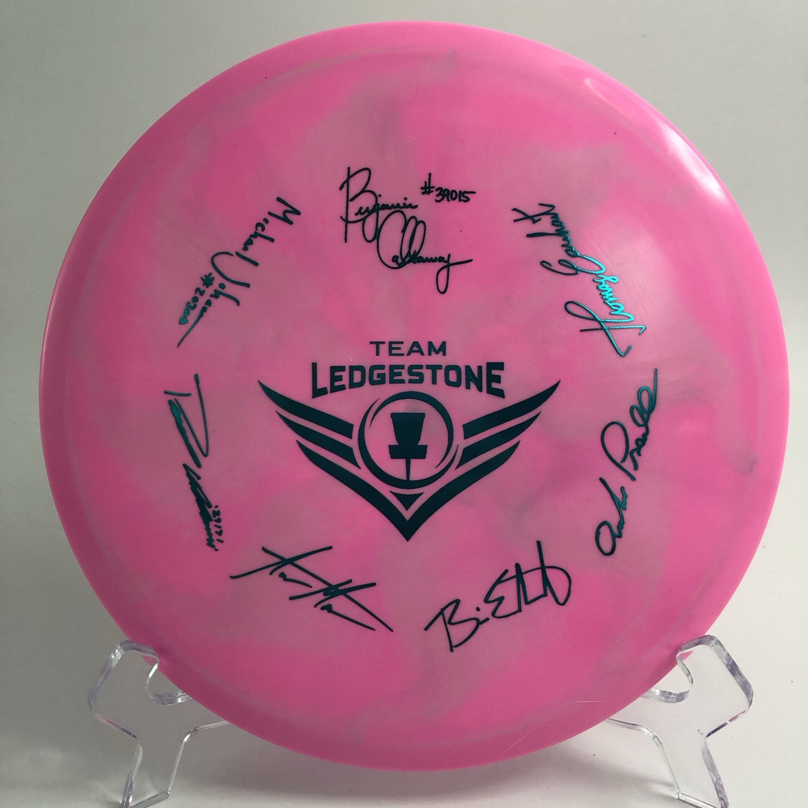 What makes this disc truly special is its limited-run ESP plastic and unique stamp featuring the signatures of all 7 members of Team Ledgestone, including stars like Paul Ulibarri and Brian Earhart! ✍️ This collector’s piece not only feels great in your hand but also has an eye-catching pink swirl color with a stunning dark turquoise reflective stamp.