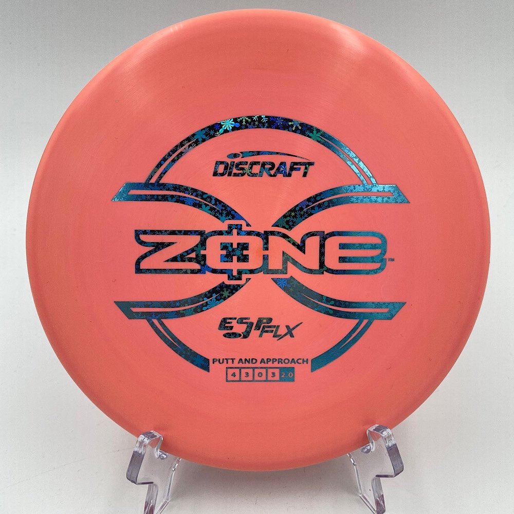 Disc: Discraft Swirl ESP FLX Zone (170-172g) Profile: flat Stiffness: extra soft Color: pinkish orange swirl (see picture) Stamp: snowflake hologram stamp (see picture)