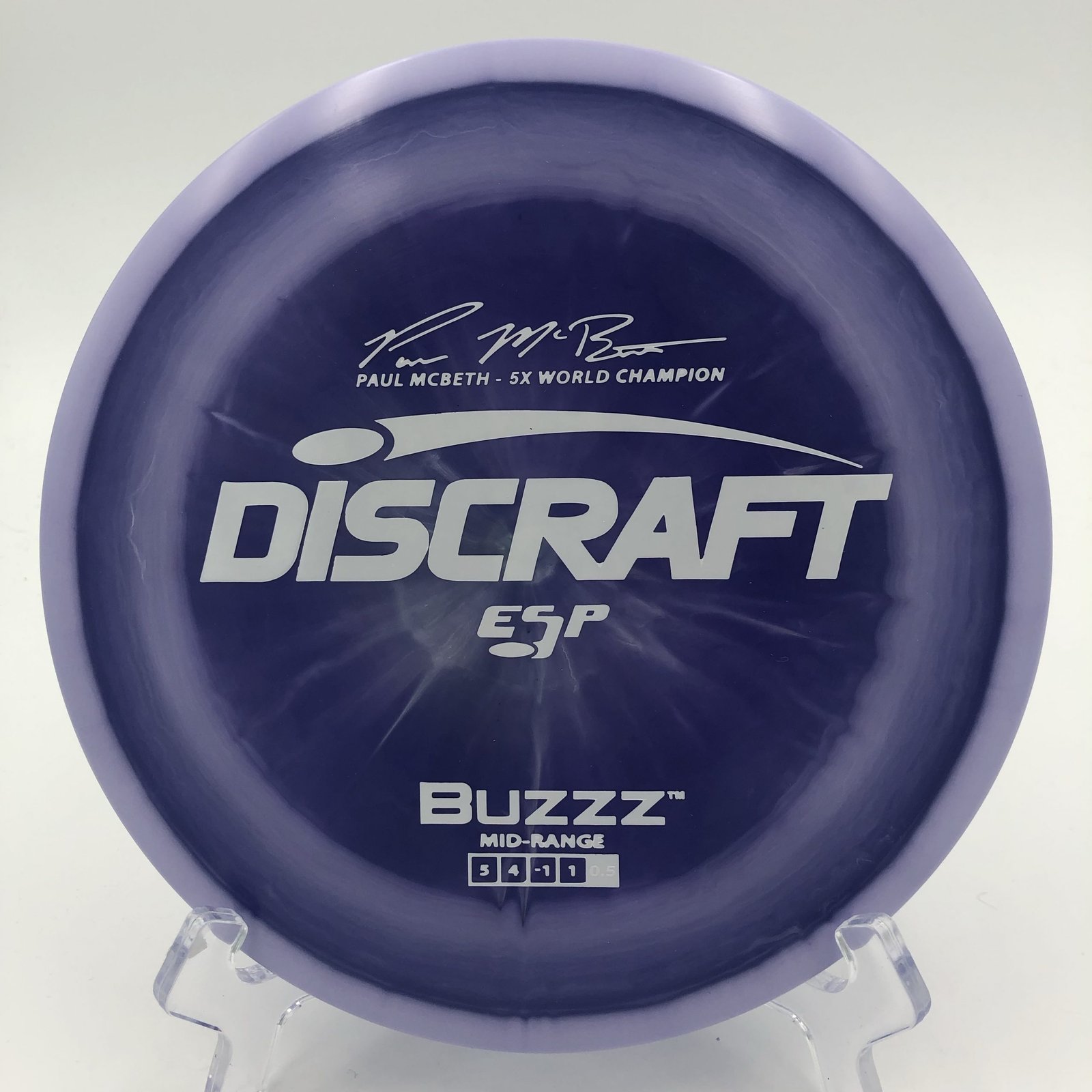 Introducing the Discraft Swirly ESP Buzzz – Paul McBeth 5x! 🥇 This stunning midrange disc, weighing 177+ grams, features a beautiful dark blue-purple swirl with a light blue rim and a crisp white stamp that will surely stand out in your bag. Crafted for performance, its flat profile and medium-soft stiffness allow for excellent grip and control on every throw. 💥