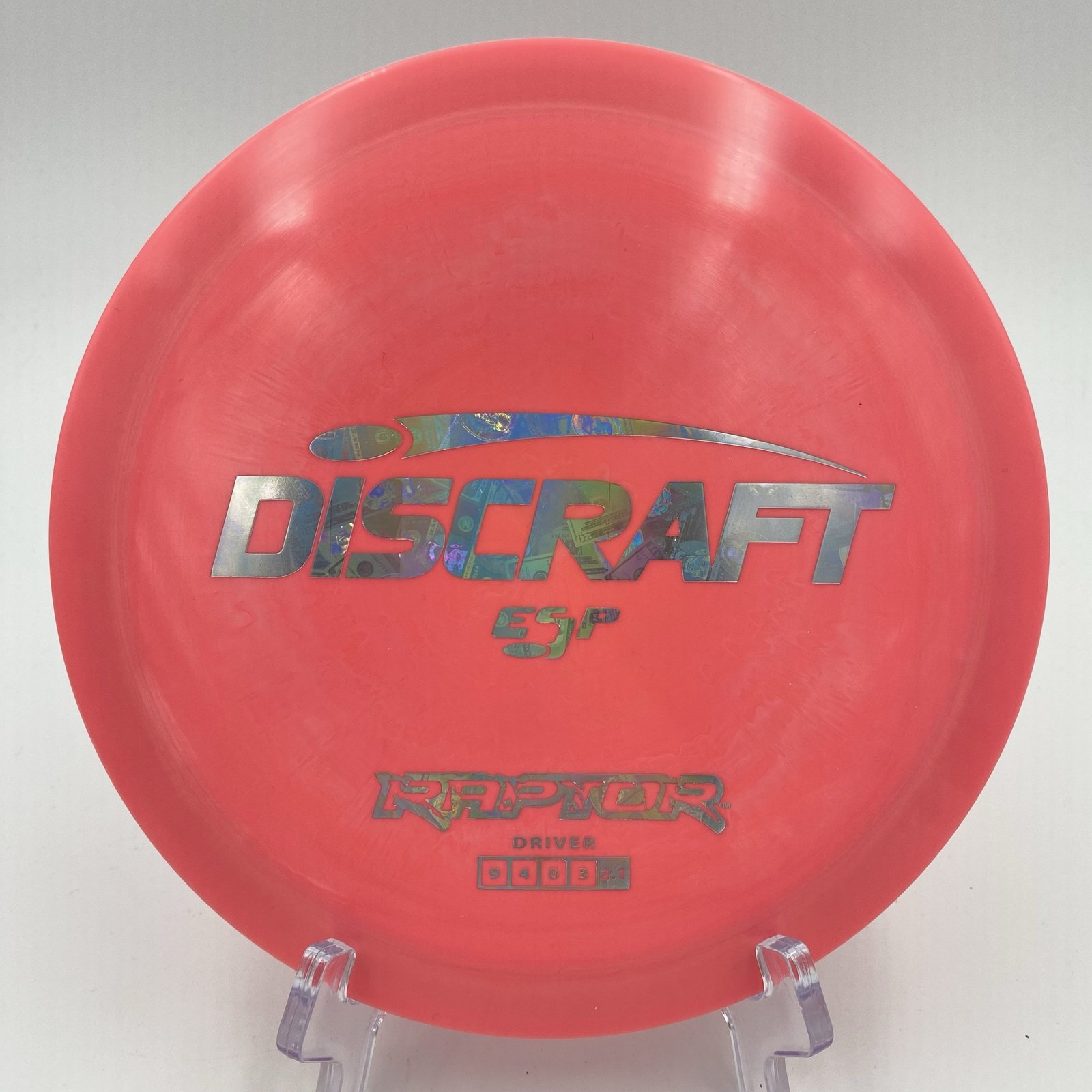 Disc: Discraft Swirly ESP Raptor (173-174g) Profile: flat Stiffness: medium Condition: New (small storage wear) Color: pink swirl, money reflective stamp (See picture)