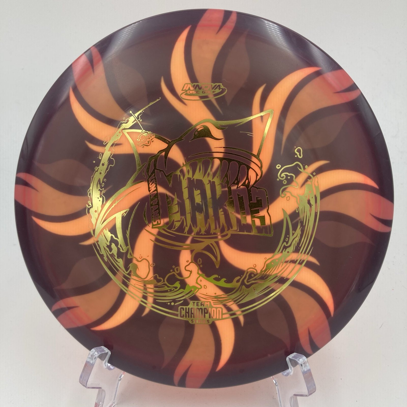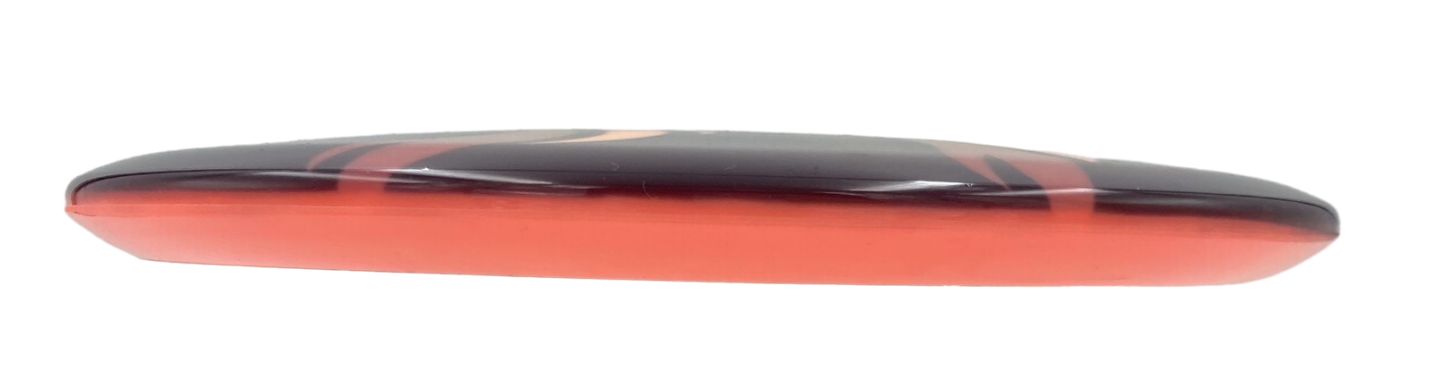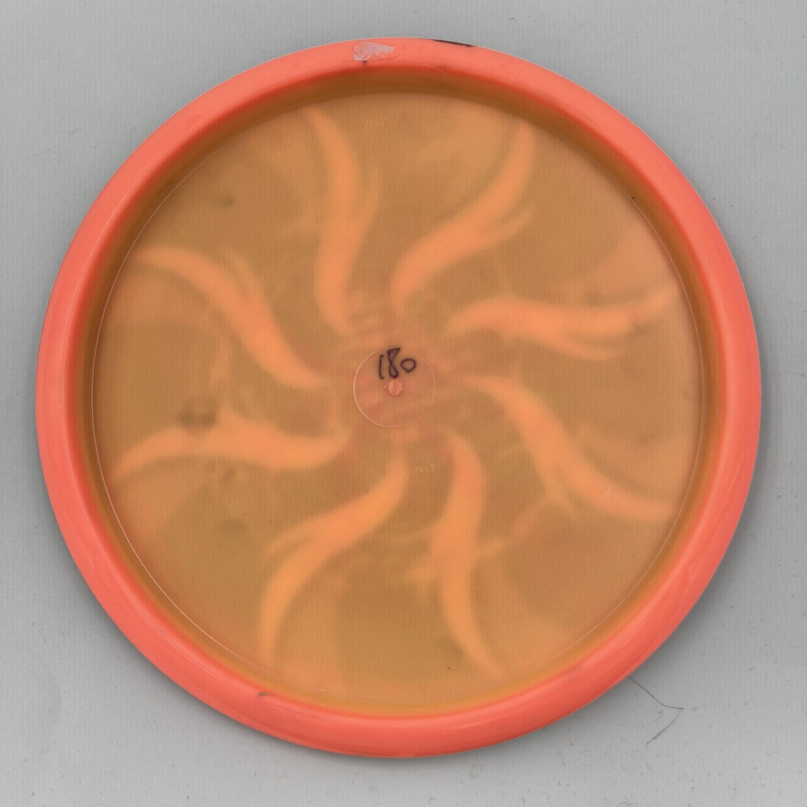 Crafted in premium Star plastic with a domey profile and medium-soft stiffness, it feels incredible in hand—perfect for intermediate players seeking a touch of forgiveness on those windy days. 🌟 And let’s talk about the eye-candy: a mesmerizing orange-pink swirl dye job by the talented folks at Discs by Drake, paired with a gold reflective stamp and black-gray dyed accents that scream ‘Dark Star’ vibes. It’s new condition with just a hint of storage wear and minor ink drop-out from the dyeing process, adding to its unique, battle-ready charm.