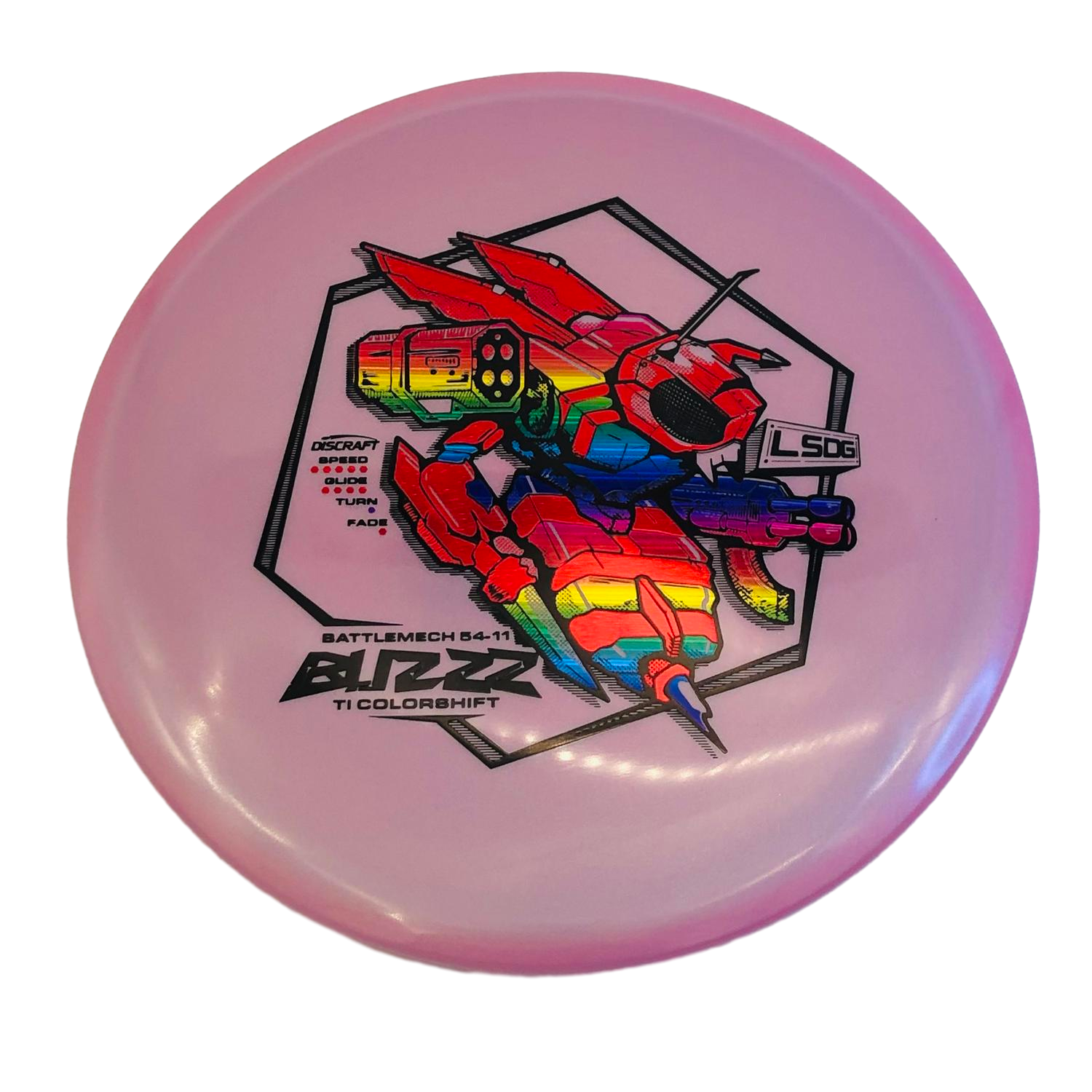 Crafted from premium Titanium Colorshift plastic, this disc not only performs but looks stunning too, featuring a unique metallic sheen that changes in different lighting conditions. Its design, adorned with a battle-ready mech, embodies strength and reliability. Perfect for every player’s bag, the Buzzz makes a fantastic addition for short, technical holes or for navigating through dense trees. Get ready to conquer the course with this reliable companion! 💪🍃