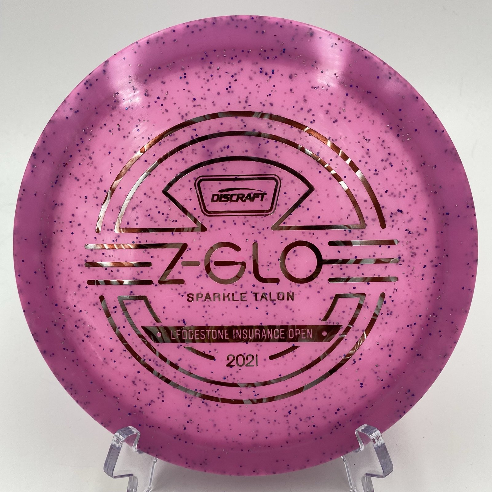 Disc: Discraft Z Glo Sparkle Talon -2021 Ledgestone Edition (173-174g) Profile: small domey Stiffness: medium hard Color: pink-purple, rose stamp (see picture)