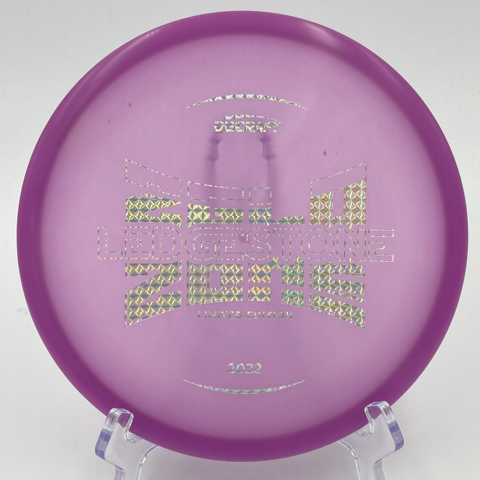 Disc: Discraft Z Glo Zone – Ledgestone 2022 Edition (173-174g) Profile: flat – concave Stiffness: medium Condition: New (small storage wear) Color: purple (silver pixel reflective stamp), See picture