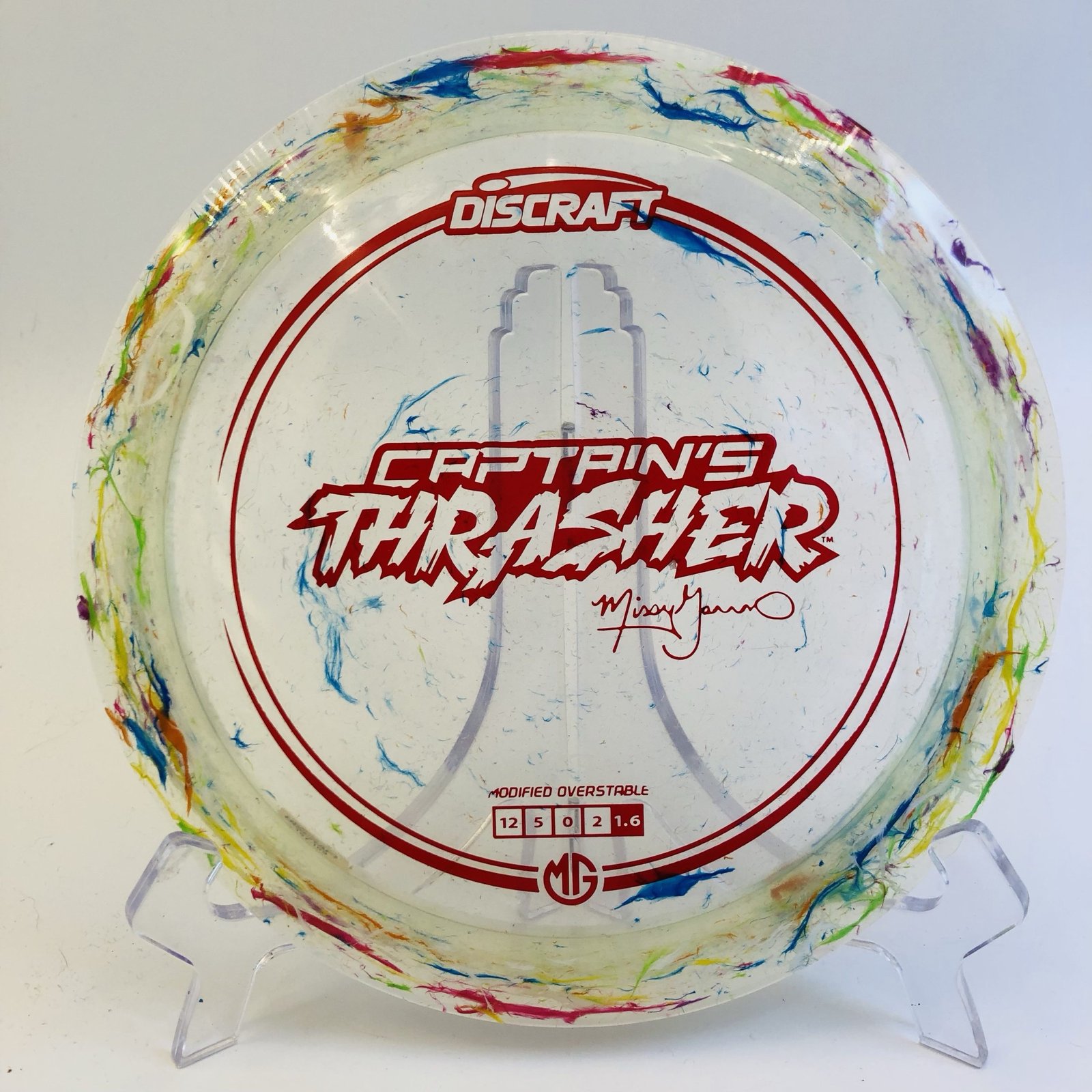Disc: Discraft First Run Captain’s Thrasher Profile: flat Condition: New (storage wear) Stiffness: medium soft Color: transparent swirl (see picture of the exact disc) Stamp color: matte red (see picture)