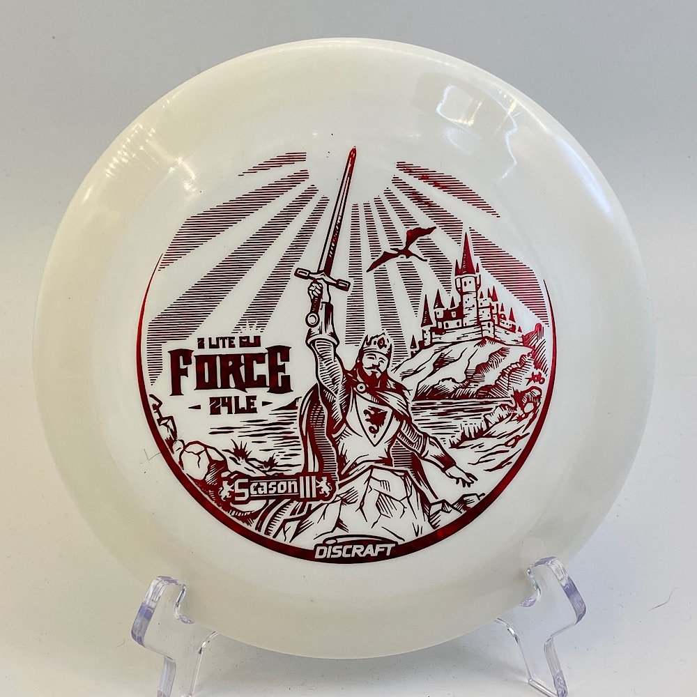 Disc: Discraft Z Lite Glo Force Profile: Flat Stiffness: soft Color: white (see picture) Stamp color: red shatter reflective (see picture)