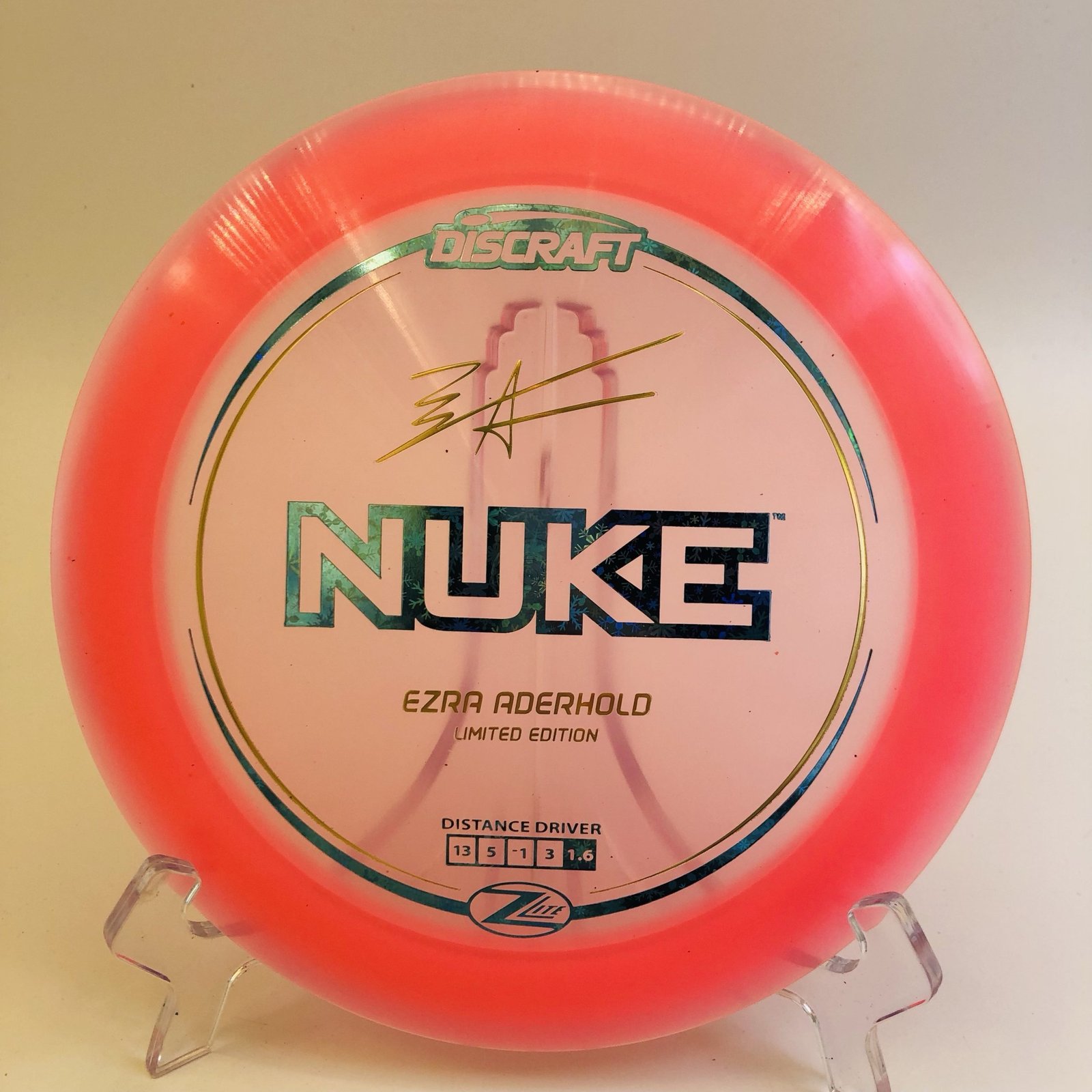 The striking pink color combined with a stunning turquoise blue snowflake and gold holographic stamp makes this disc not only a powerhouse on the course, but also a stunning collector’s item! 🎨 Whether you’re laying down bombs on the fairway or seeking to impress your friends with your technique, the Z Lite Nuke is your go-to for explosive drives. Grab yours today and experience the thrill of flying discs like never before! ✨🏌️♂️
