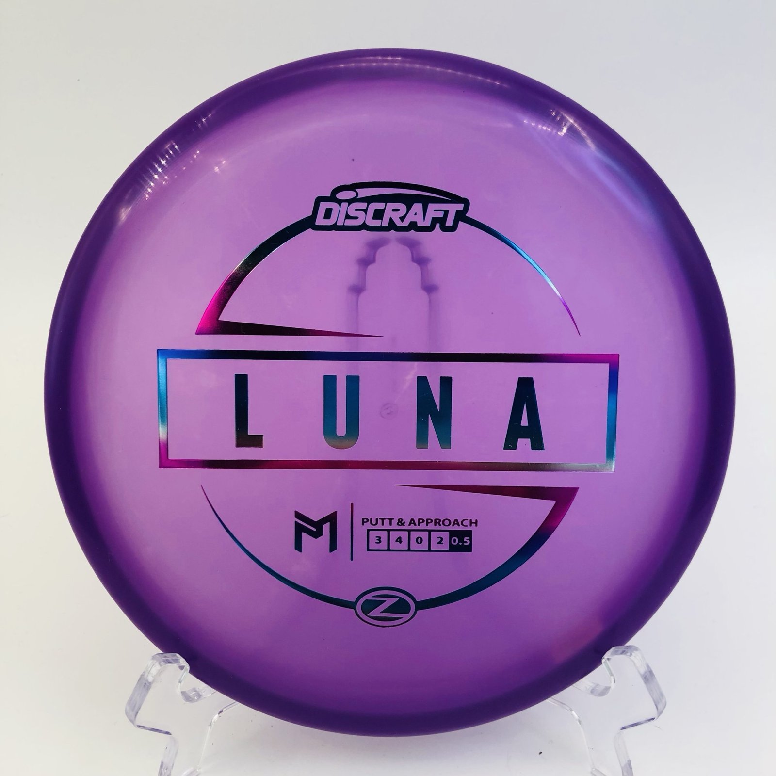 Disc: Discraft Luna Profile: flat Stiffness: medium Condition: New (storage wear) Color: dark purple (see product pictures) Stamp color: sunset rainbow reflective (see picture)