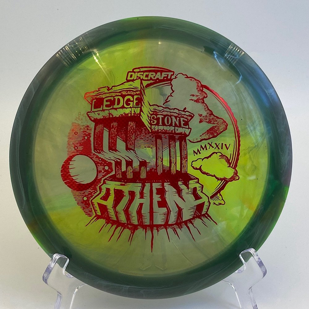 Introducing the Z Swirl Athena – 2024 Ledgestone Edition, a must-have for any serious disc golfer! 🌟 This stunning fairway driver, weighing in at 170-172g, features a smooth blend of dark green swirl plastic adorned with a striking red reflective stamp.