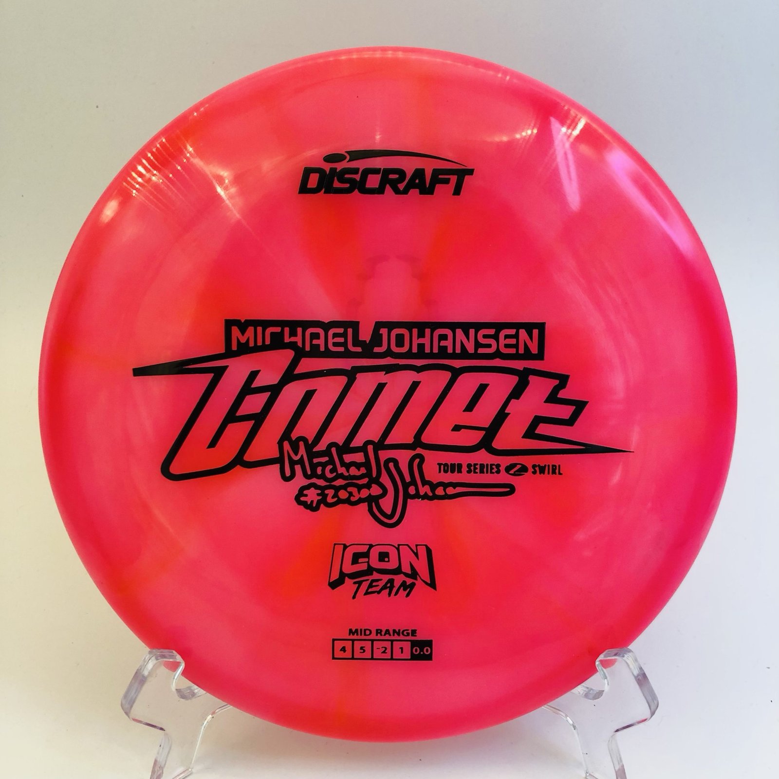 Introducing the Z Swirl Comet (177+g) – Michael Johansen Icon Team 2025 Tour Series! 🎉 This legendary midrange disc is your go-to partner for achieving high-level accuracy and exceptional glide on the course. With flight numbers of Speed 4, Glide 5, Turn -2, and Fade 1, the Comet is designed to float effortlessly down the fairway, delivering straight and controlled flights every time! 🌈