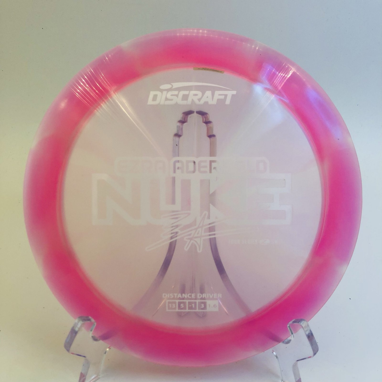 This stunning transparent pink swirl disc not only looks amazing with its eye-catching color but also brings a sleek aerodynamic design that helps cut through the air effortlessly. Whether you’re navigating tight fairways or launching bombs down open lanes, the Z Swirl Nuke will be your trusty companion! 🚀