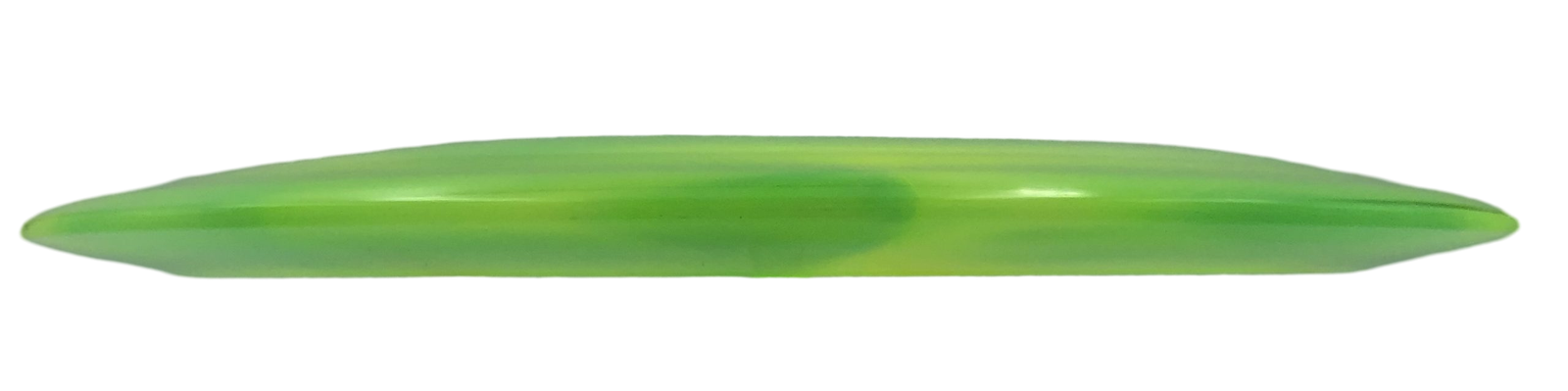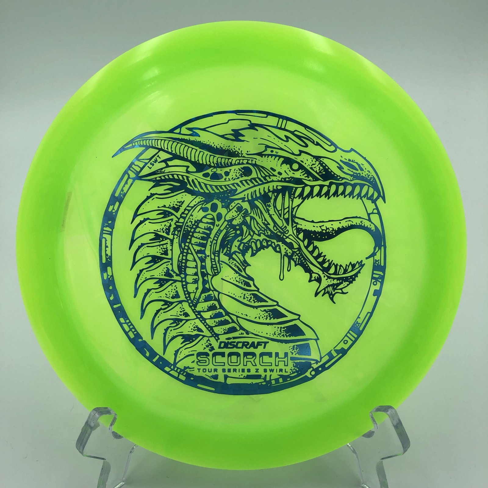 Disc: Discraft Z Swirl Scorch – LSWT (170-172g) Profile: medium domey – domey Stiffness: medium Condition: New (storage wear) Color: green, turquoise ice reflective stamp (See picture)