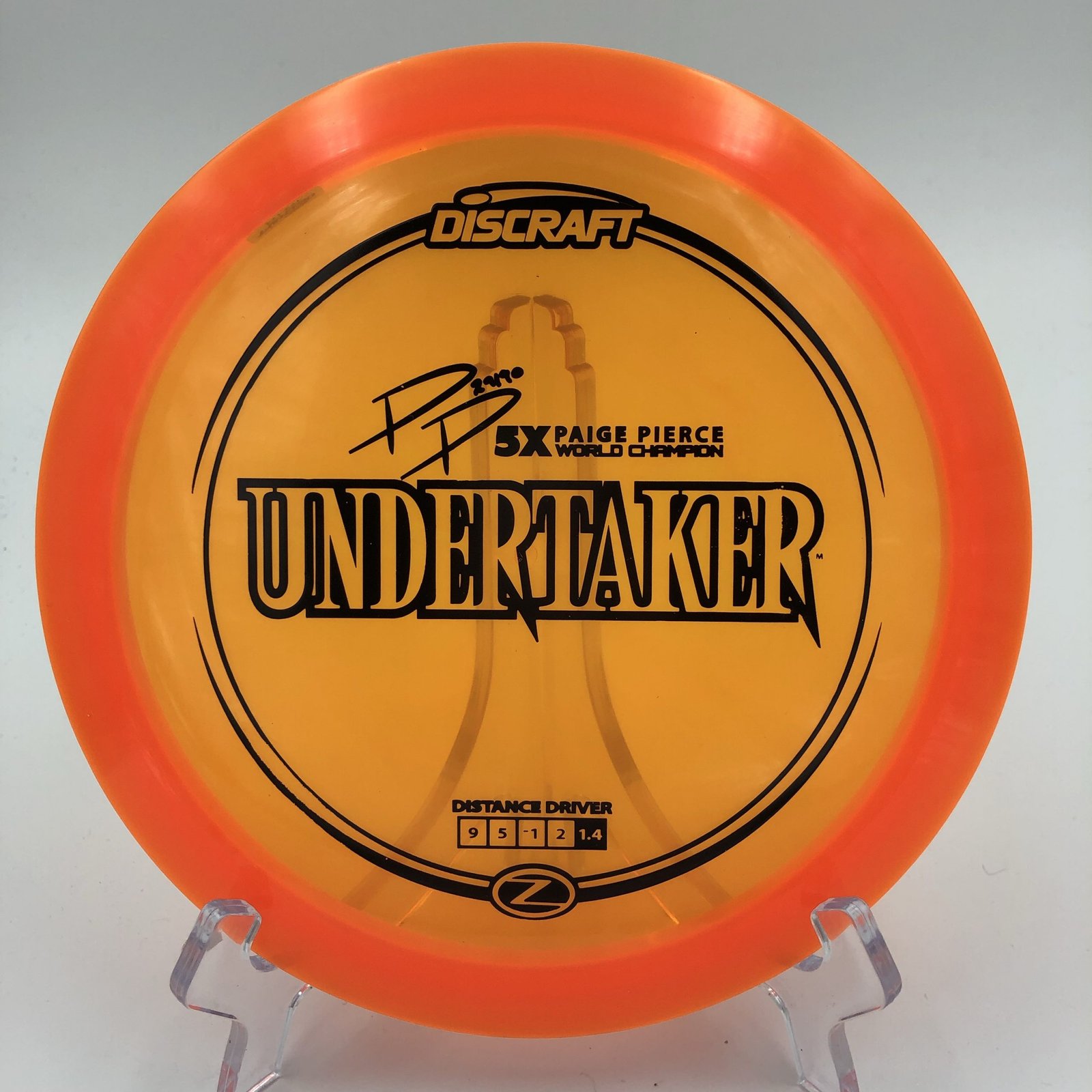Disc: Discraft Z Undertaker – 5x Paige Pierce (173-174g) Profile: flat-small domey Stiffness: Medium hard Condition: New (storage wear) Color: dark orange, black stamp (See picture)
