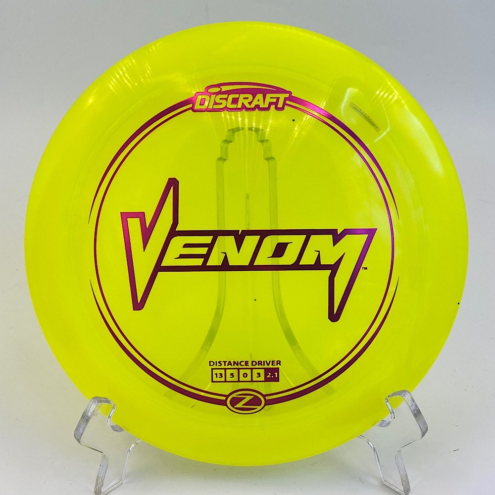 Disc: Discraft Z Venom Profile: medium domey – domey Stiffness: medium Condition: new (storage wear) Color: yellow, see picture Stamp: red-purple reflective, see picture