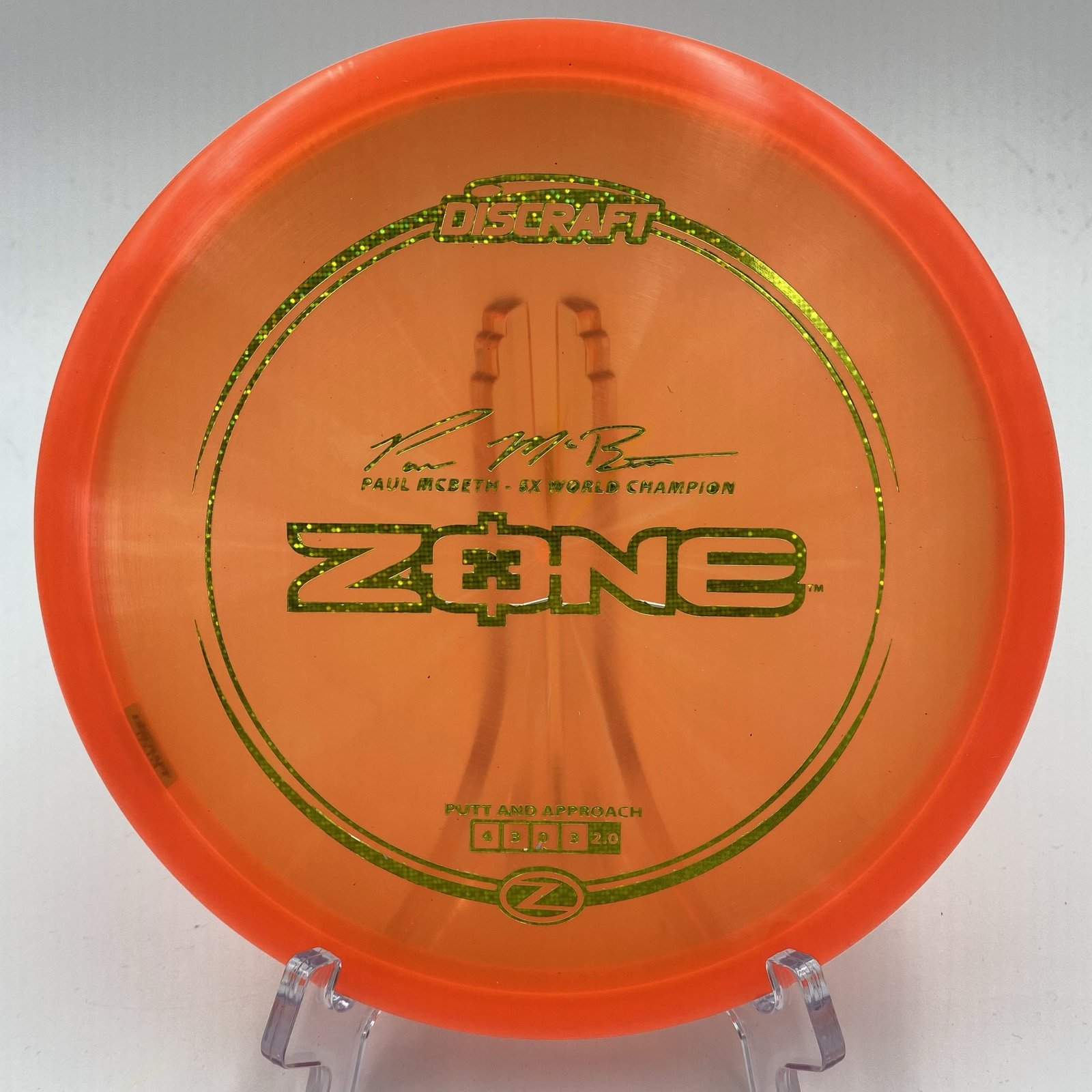 Disc: Discraft Z Zone – Paul McBeth 5x (173-174g) Profile: flat-concave Stiffness: medium soft Color: orange, yellow-green pixel reflective stamp (see picture)